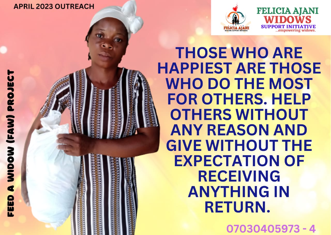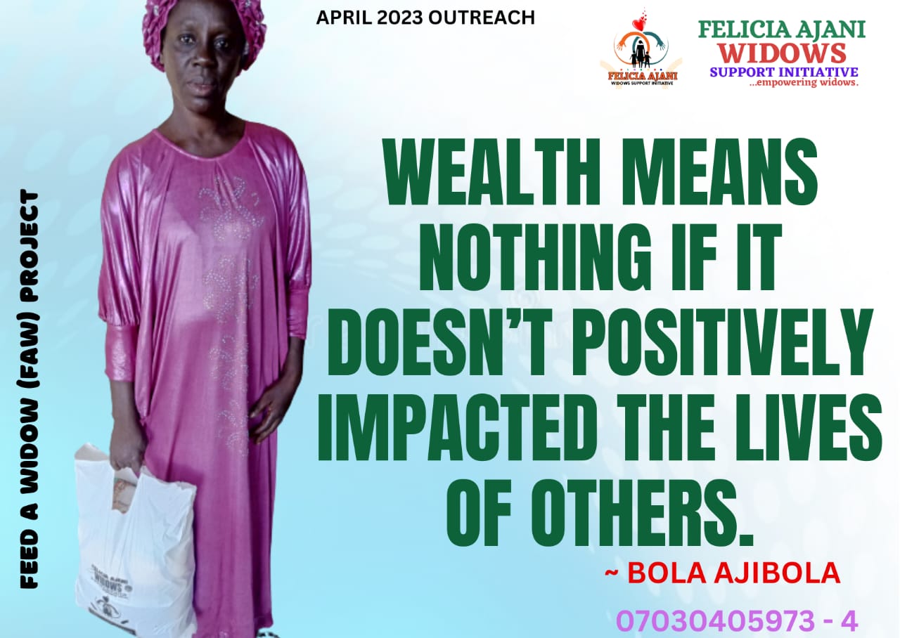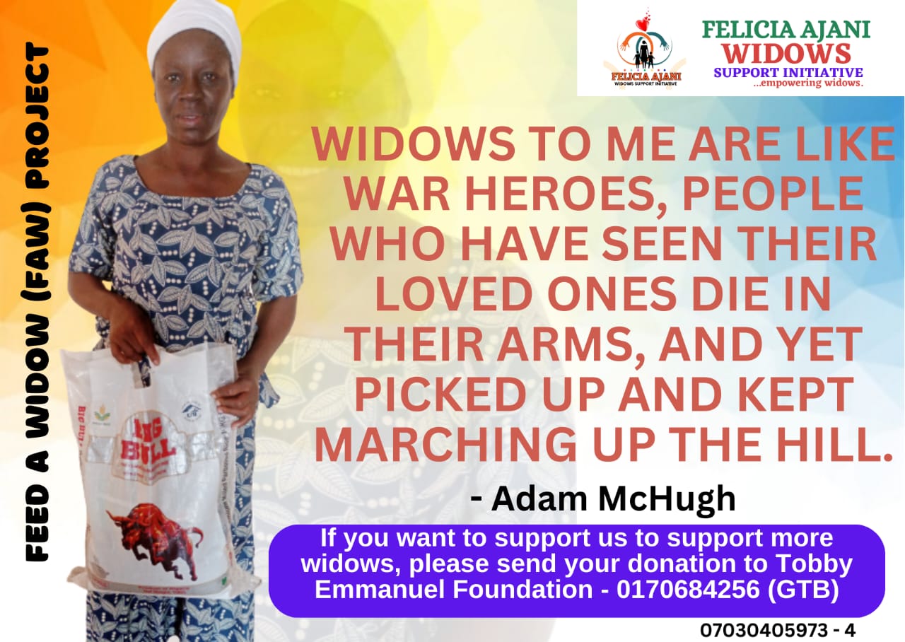 FELICIA AJANI WIDOWS SUPPORT INITIATIVE (FAWSI) was birthed as a revelation received from God by the Founder of the foundation as captured in James 1:27, which states that: “Pure and undefiled religion before God and the Father is this: to visit orphans and widows in their trouble, and to keep oneself unspotted from the world” (NKJV).